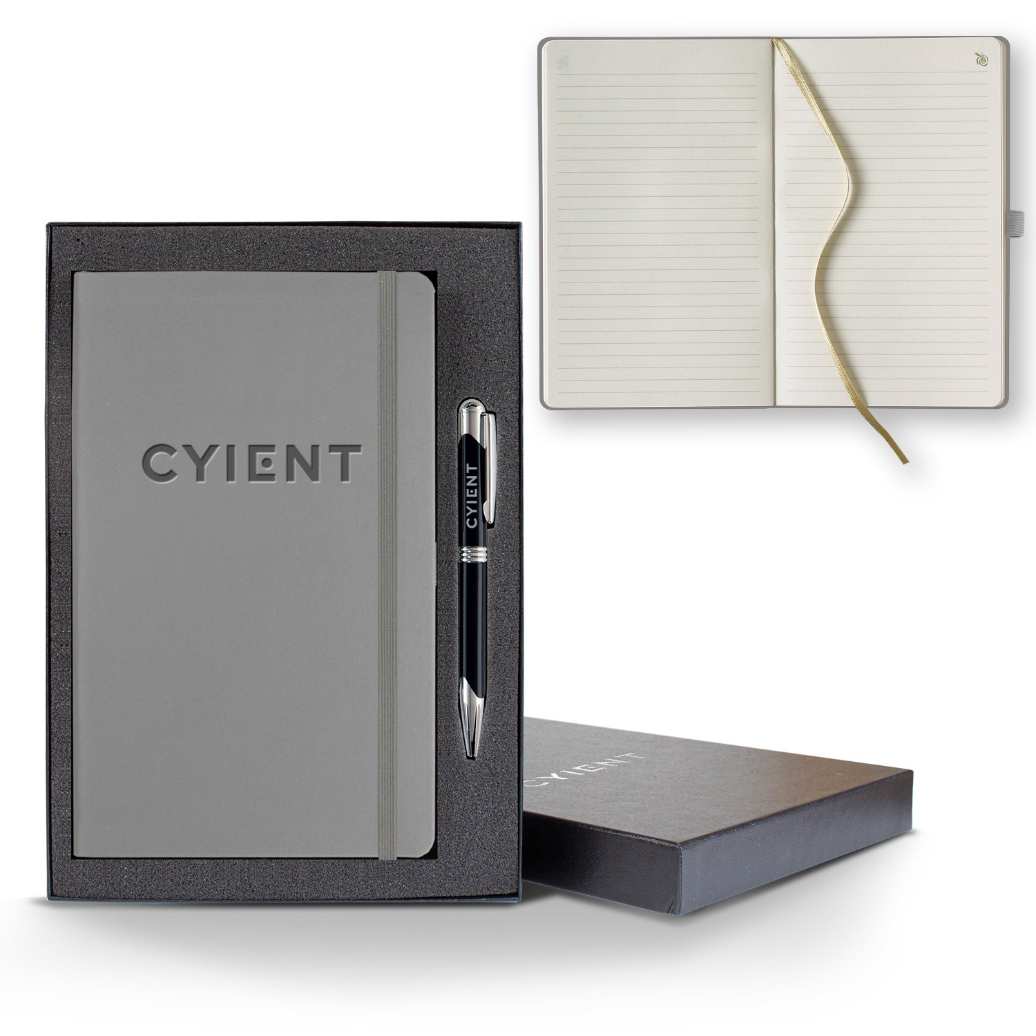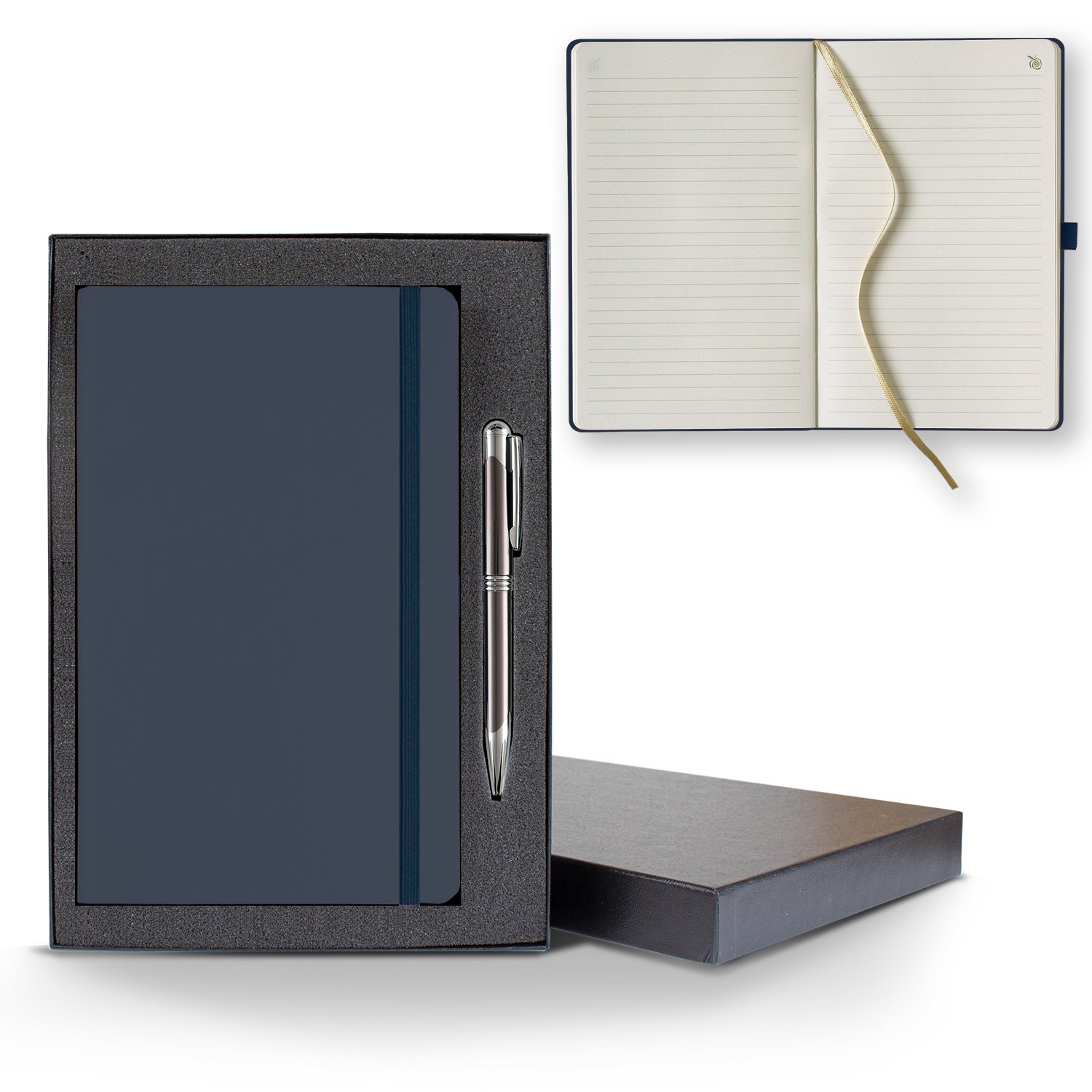Have little impact on the world’s resource while generating big gains in your business with this ApPeel® Medio Journal. Paper made from apple pulp and other vegetable fibers that have been ground and emulsified into an organic material, this item is eco and animal friendly, sustainable and all natural. It measures 5 1/4″ x 8 3/8″ and features 192 pages with green lines, pen loop, gold ribbon marker, gray end pages with colored stripes, a back pocket, and comes in a sleek black gift box with a black or gunmetal pen. Red, white, and blue pens also available upon request. Accented with an Apple Scent that comes standard. Add your logo with our standard deboss or for an extra run charge add foil stamp or a 4CP imprint.***24 Hour Color Surge minimum is 10 pieces with a maximum quantity of 250 pieces. 500/1K piece pricing is not applicable.*** FSC MIX 70% CQ-COC-000479. 5.25″ W x 8.28″ H x 0.25″ D