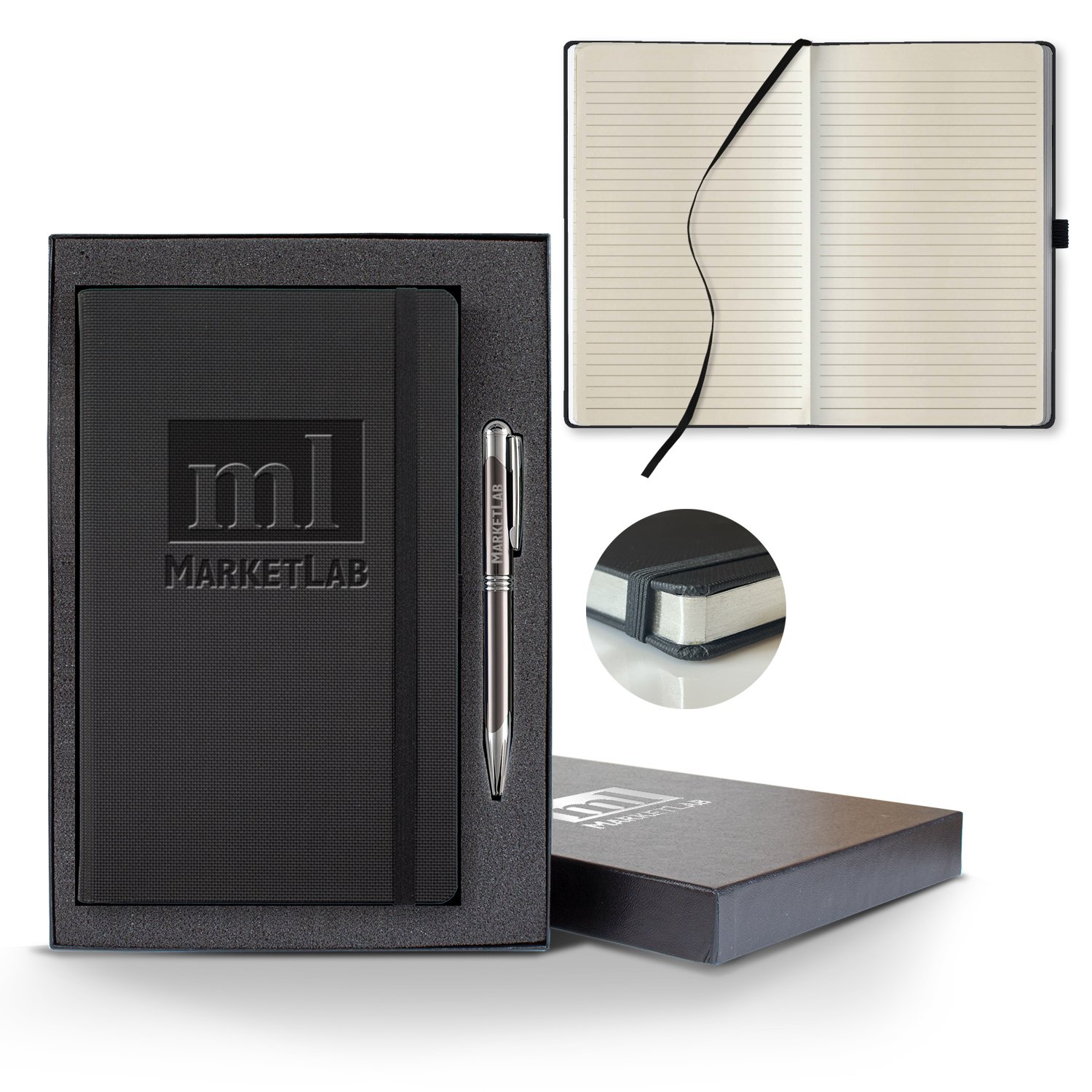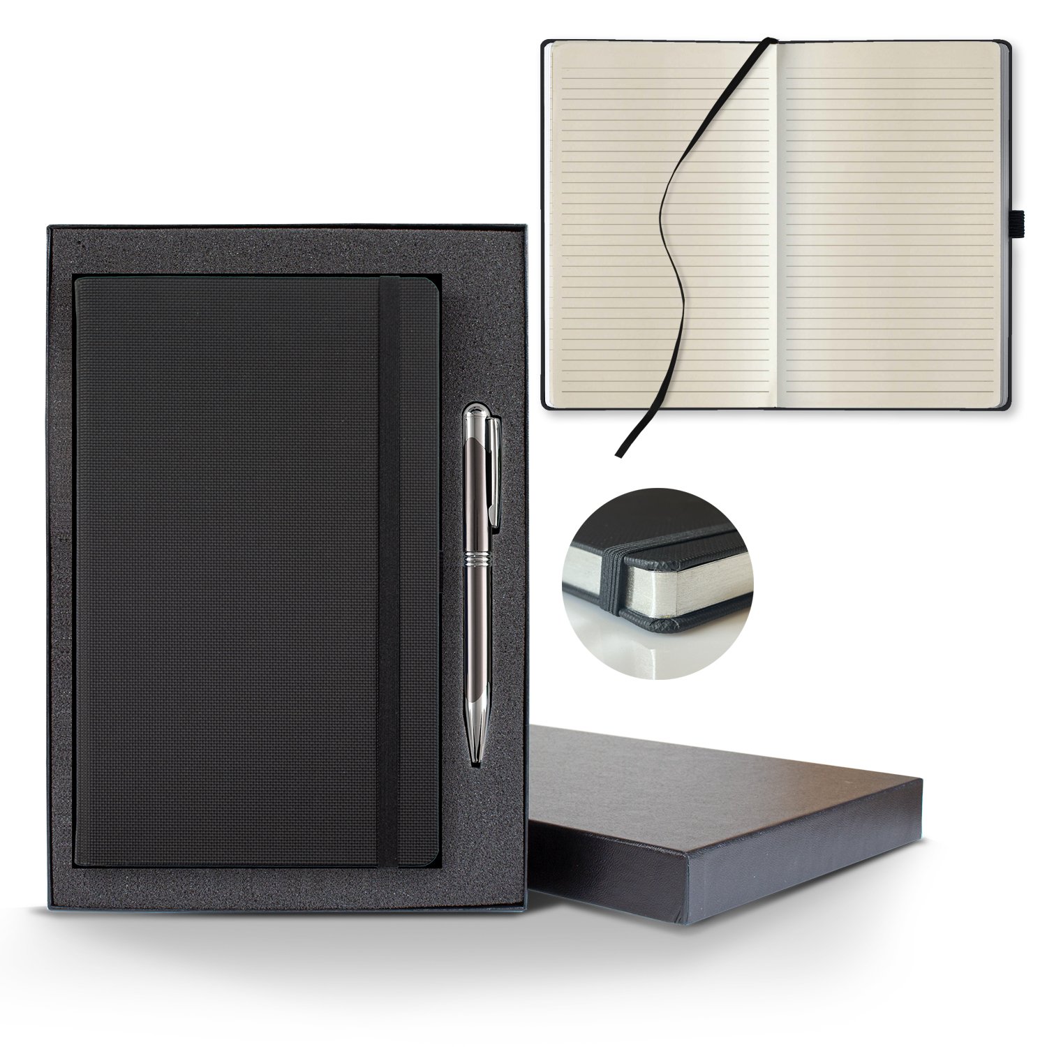This classy journal features a black textured cover paired with our Ivory lined pages with gilt edges. Timeless and sophisticated. Add a sleek black gift box to make this the ultimate gift! Size: 5 1/4″ x 8 3/8″ 224 college ruled FSC®lined Ivory pages. Silver, Black or Red gilt edges. All black elastic band, pen loop and ribbon marker. FSC MIX CQ-COC-000479. 5.25″ W x 8.38″ H x 0.5″ D