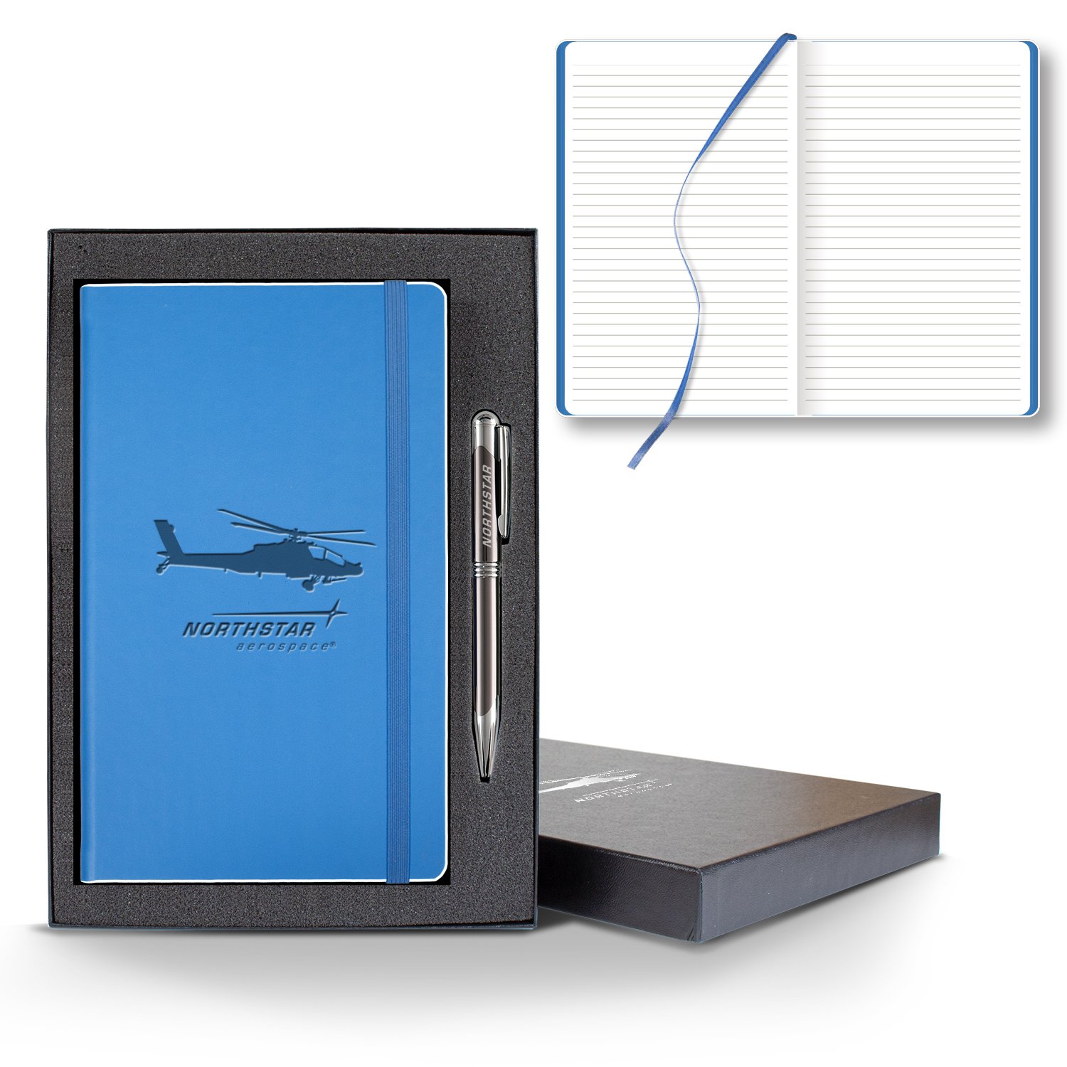 The Color Laser notebook gift set is designed seeking a clean simplicity, but its innovation lies in details. Head to class in style with this medium sized note-taker! Featuring our most popular cover material, which is a smooth-soft texture that’s often mistaken for leather and comes in a sleek black gift box including a black or gunmetal pen. Red, white, and blue pens also available upon request. You can choose from an assortment of bright vibrant cover colors and a white trim on the edge that make it pop! It makes a great giveaway that is sure to remind recipients of your company’s customer service, plus it will put your message in front of them on a daily basis! Size: 5 1/4″ x 8 3/8″ with 224 White college ruled lined FSC ® certified pages with gray print. Matching ribbon marker and elastic band. FSC MIX CQ-COC-000479. 5.28″ W x 8.38″ H x 0.5″ D