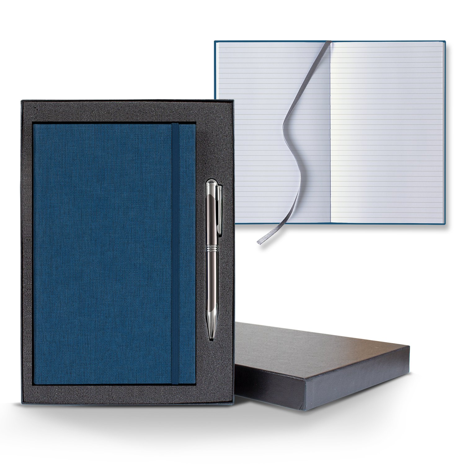 Make a bold statement with a unique item like this Linen Banded Medium Journal. It’s got a cover that feels like linen with a matching-color elastic band closure. Inside this 5 1/4″ x 8 3/8″ book are 192 white pages with gray lines and a silver ribbon marker. Imprint this to boldly show off your logo. This giftset comes in a gift box with a metal pen. Pens are available in black, gun metal, white, blue, or red. The gift box and the pens can be decorated for an additional charge. When you hand this out to customers they will begin to trust that you provide the best products and services. This is a great way to increase your business! FSC MIX 70% CQ-COC-000479. 5.25″ W x 8.375″ H x 0.5″ D