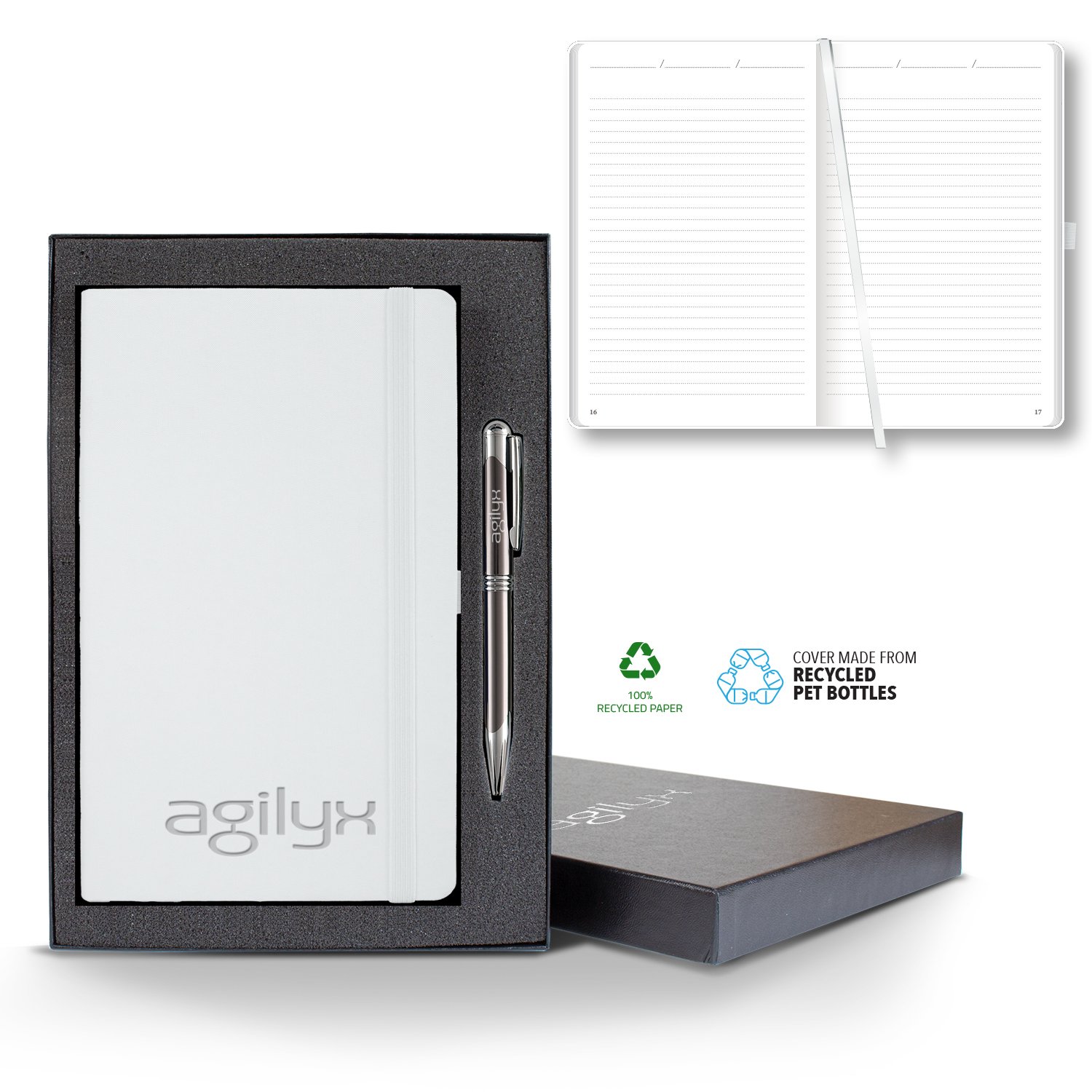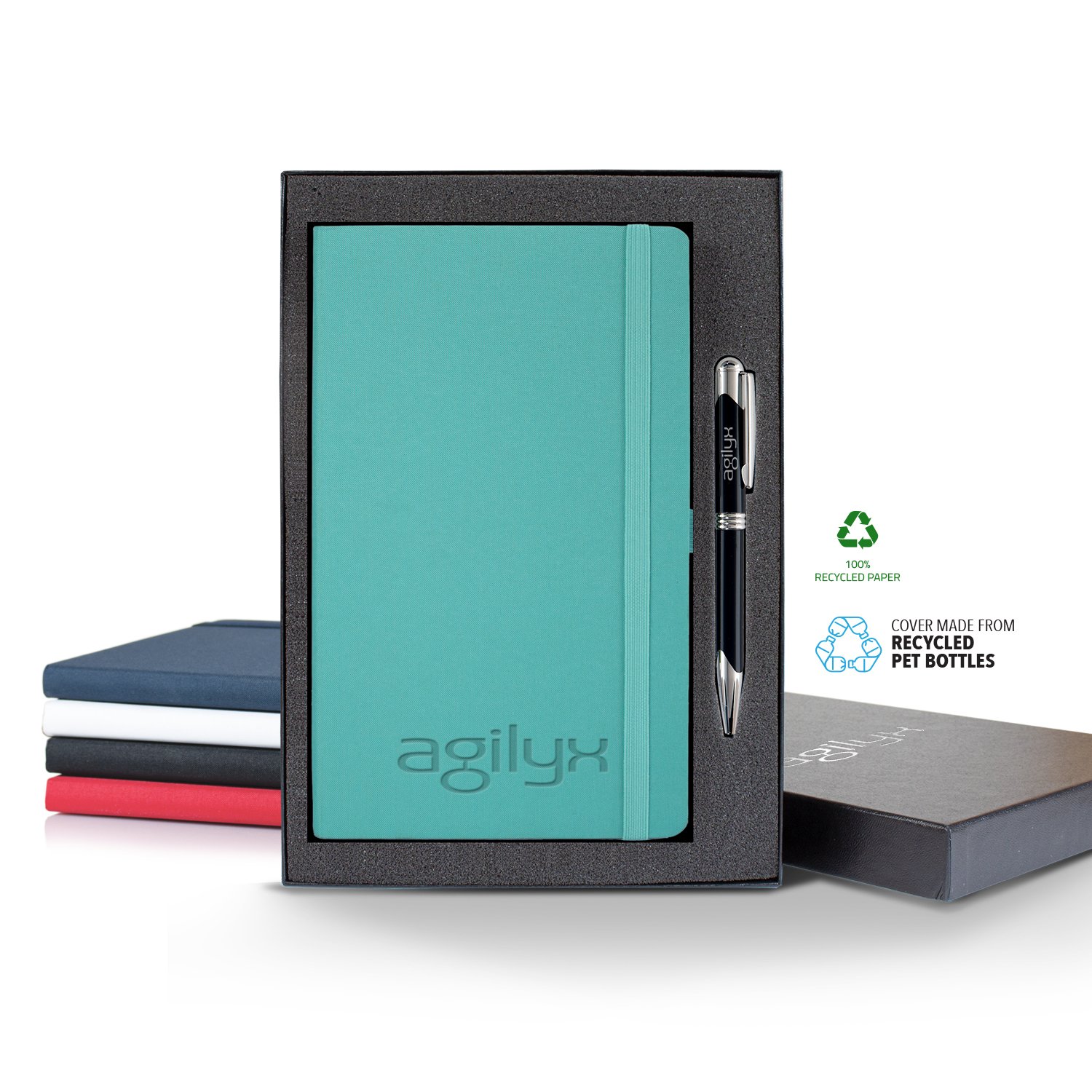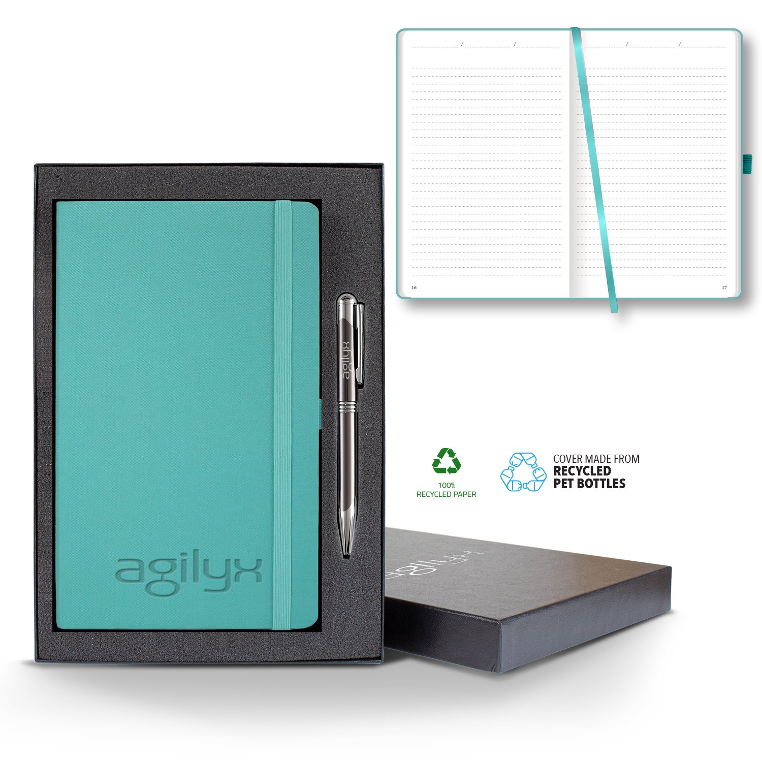 The Oceano journal offers a 100% top quality recycled paper, presented in a nice range or colors. The plastic that pollutes our oceans is recovered through an upcycle process and transformed into an eco-friendly polyester fabric cover. The crafted round corners and the gray dotted ruled format gives an elegant look, while the combination of page-numbering and initial index makes it easier for users to track their notes. Writing by hand is thinking on paper: think green and let your thoughts flow freely in the eco-friendly journal.The Oceano Journal Gift Set comes in a sleek black gift box and includes a black or gunmetal pen. Red, white, and blue pens are also available upon request.Size: 5 1/4″ x 8 3/8″ with 160 recycled pages, gray print and matching ribbon marker. FSC MIX CQ-COC-000479. 5.25″ W x 8.58″ H x 0.5″ D