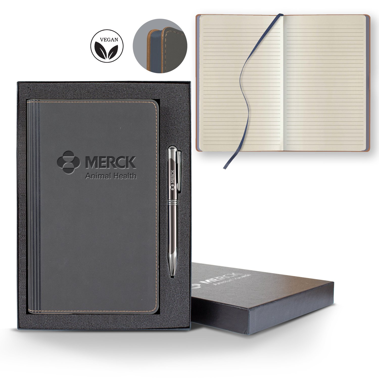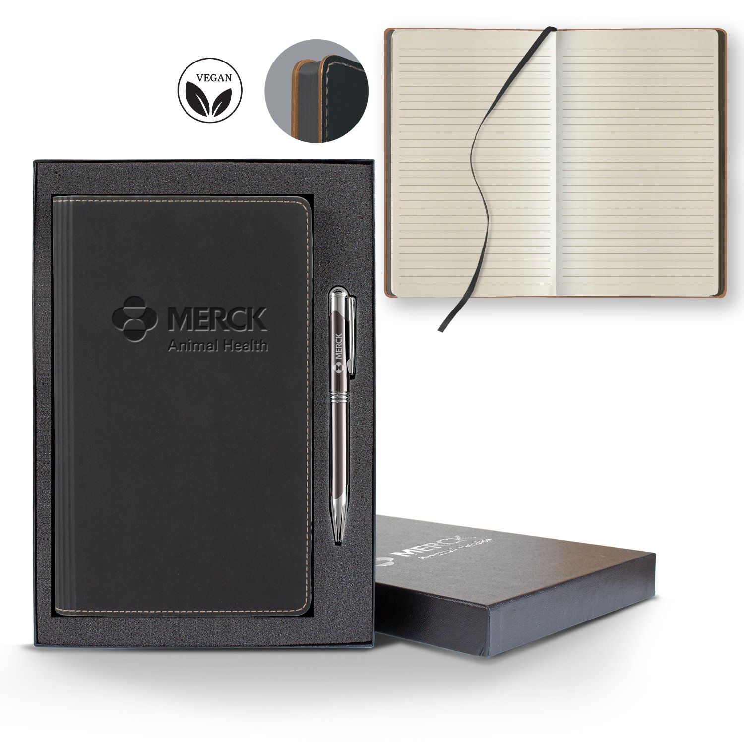 Vegan is just that! These notebooks are made of certified bio-based material, highly refined. Offering an ecological alternative to leather and more sustainable and biodegradable than synthetic fabrics. Sophisticated sleek look with a contrasting cover trim color, perimeter stitching, ribbed debossed spine and matching ribbon and black end pages.It’s a great choice for seminars, business meetings, and much more. Get extra brand exposure by taking advantage of our classic debossing and gift box packaging options! Each journal comes with a sleek black gift box plus a black or gunmetal pen! Red, White, & Blue pens are also available upon request.Size: 5 1/4″ x 8 3/8″ with 224 Ivory college ruled lined pages FSC® certified with gray print FSC MIX CQ-COC-000479. 5.25″ W x 8.38″ H x 0.5″ D